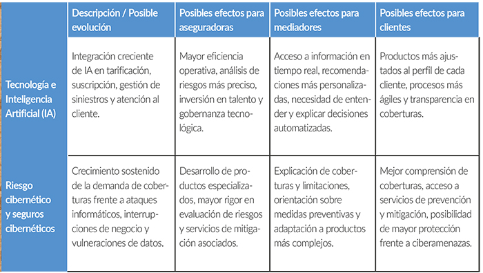 La inteligencia artificial (IA) y otras tecnologías continúan influyendo en la operativa y en la oferta de los seguros. Algunas proyecciones sectoriales indican que la IA será una de las tendencias más relevantes para 2026 y se espera que su impacto se acelere en funciones clave del negocio, desde la suscripción hasta la gestión de siniestros.