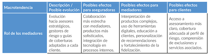 El uso creciente de herramientas digitales por parte de aseguradoras y mediadores también podría transformar la operativa de estos últimos. Ante esta situación, los mediadores podrían acceder a información más precisa y en tiempo real sobre perfiles de riesgo, historial de siniestros y exposiciones de clientes, lo que les permitiría ofrecer recomendaciones más personalizadas, anticipar necesidades y reforzar la fidelización. Además, probablemente adopten un papel educativo, explicando cómo los cambios regulatorios, los riesgos emergentes y la evolución del mercado de reaseguro pueden influir en las coberturas y en las primas disponibles.