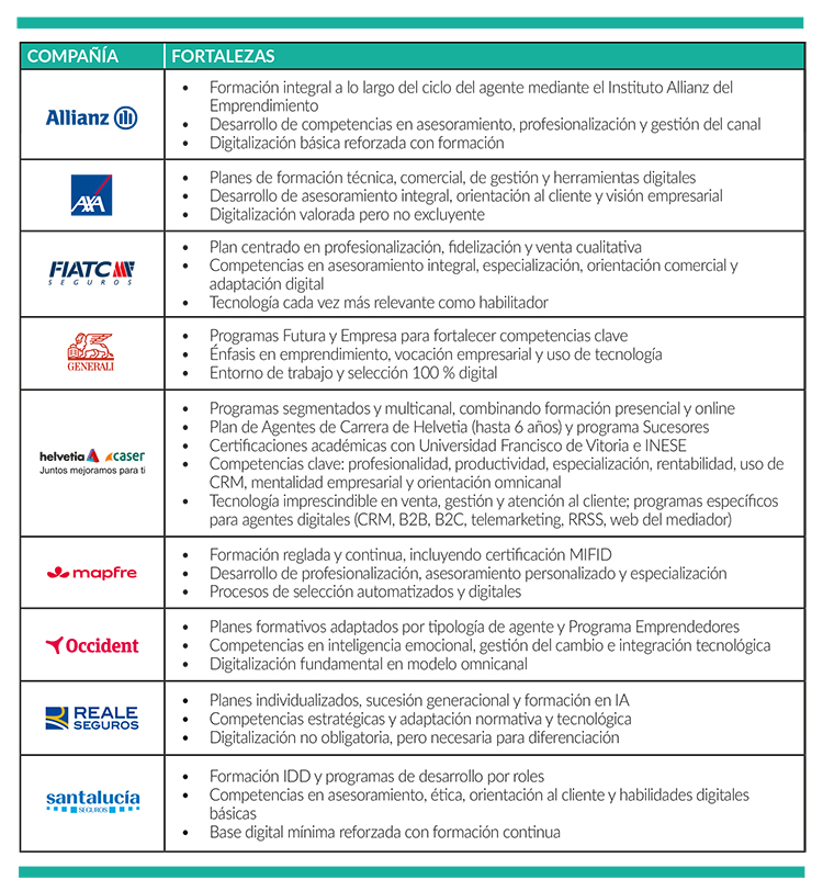 En materia de formación, las compañías se alinean en estrategias similares. Todas priorizan la formación continua, el desarrollo de competencias empresariales y la integración de la tecnología como apoyo al asesoramiento. La principal diferencia entre ellas reside en la importancia que otorgan a la digitalización en la selección de nuevos agentes, que puede ser decisiva o gradual según la entidad.