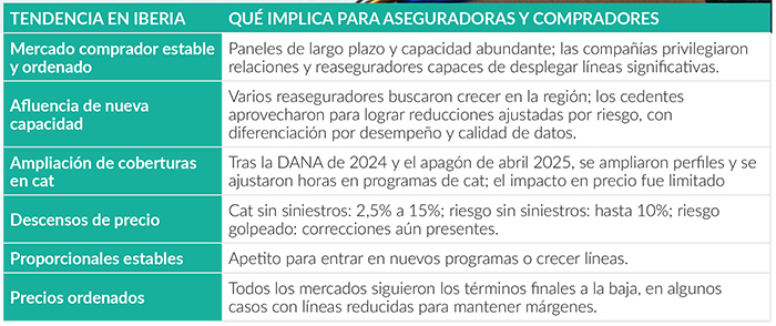 En Daños y Retrocesión, los cuatro bróker describen un exceso de capacidad y paneles sobrecolocados, con reducciones del 10%–20% en property cat sin siniestros. Crece el uso de agregados y subcapas para recomprar protección de frecuencia y los bonos catástrofes se consolidan como complemento.