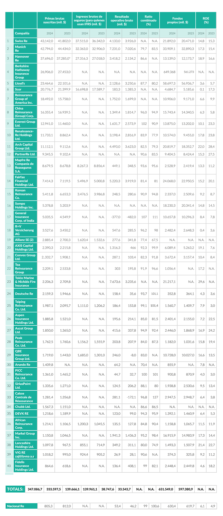 La edición 2025 del informe ‘Global Reinsurance Highlights’ de S&P Global Ratings incluye datos de 127 organizaciones de reaseguro de 29 países. En la elaboración del ranking de los 40 mayores reaseguradores globales se utilizan las primas brutas suscritas correspondientes exclusivamente al negocio de reaseguro. Mapfre Re mejora tres puestos su posición en un año, desde el 16º hasta al 13º.